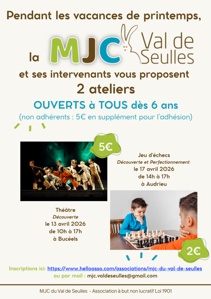 Ateliers théâtre et échecs pendant les vacances de printemps par Angelo MAFFIONE | Avr 13, 2026 | Non classé Inscriptions en ligne en cliquant sur l’affiche Ou demander le formulaire par mail: mjc.valdeseulles@gmail.com